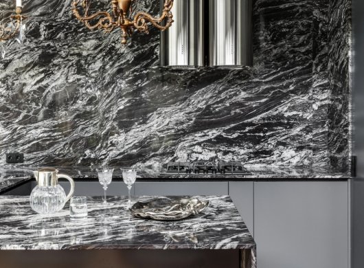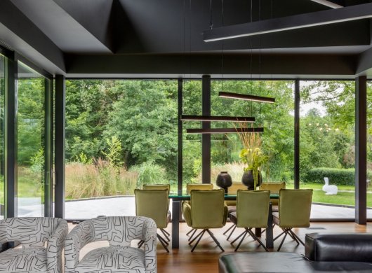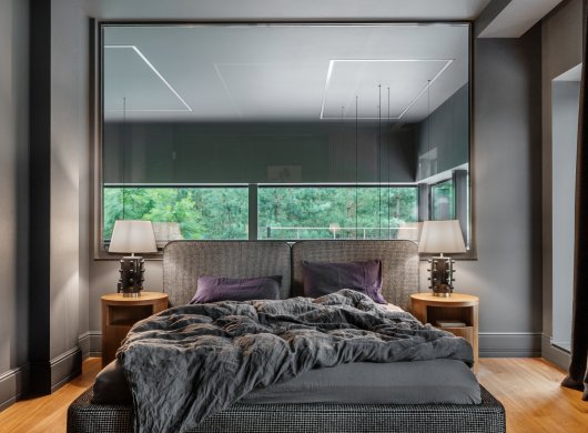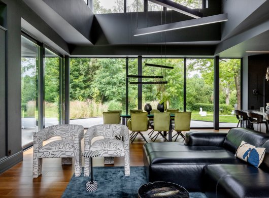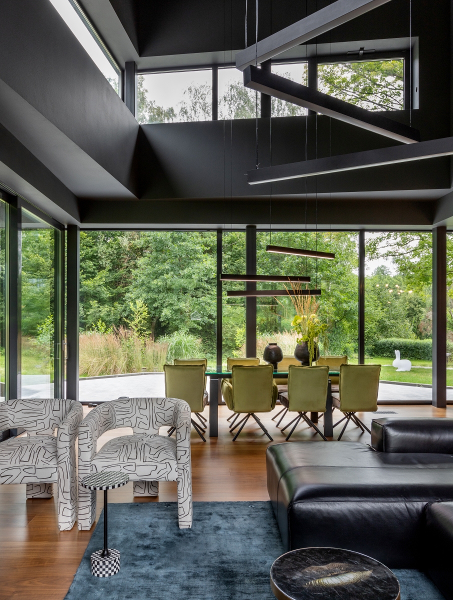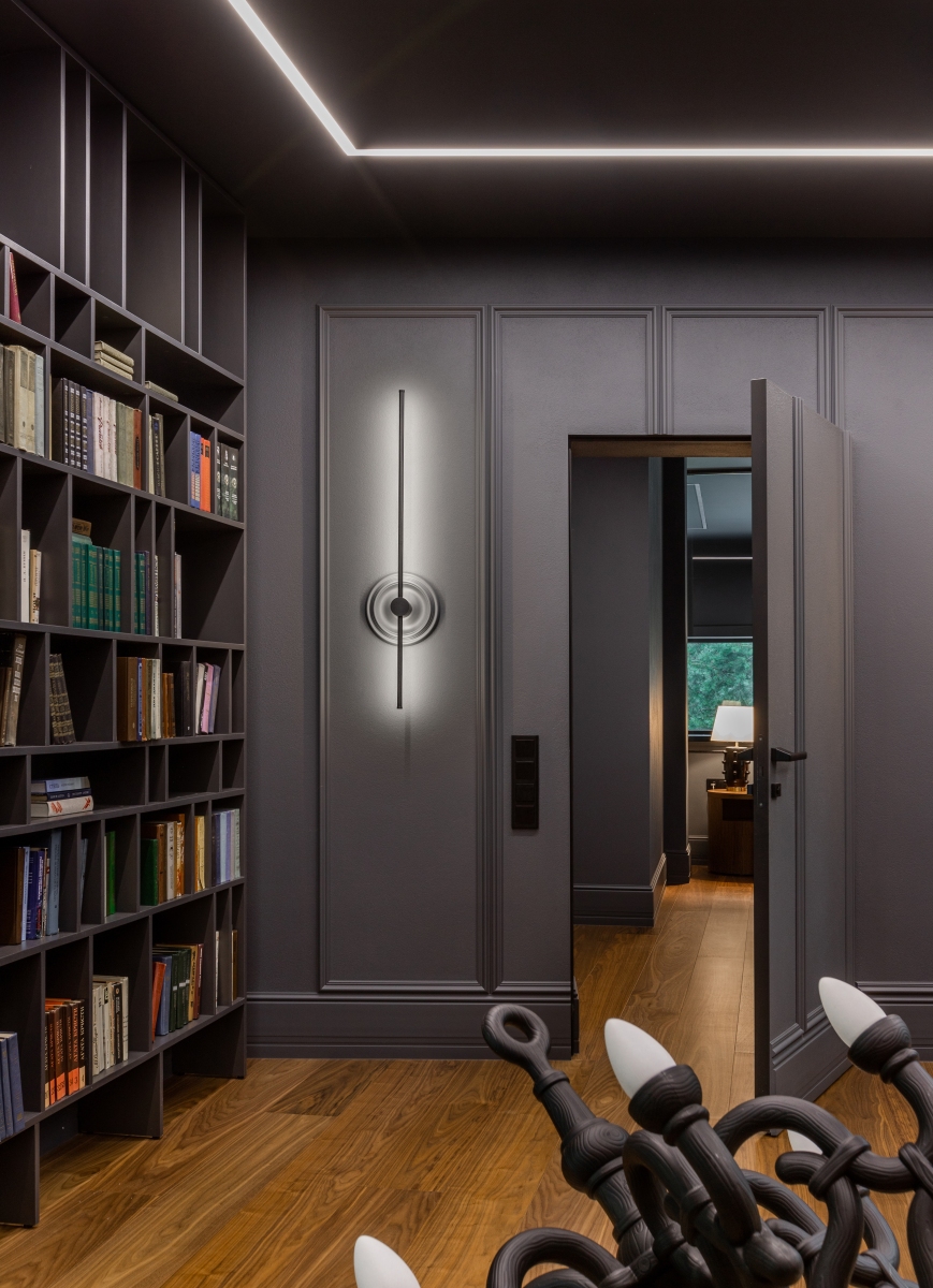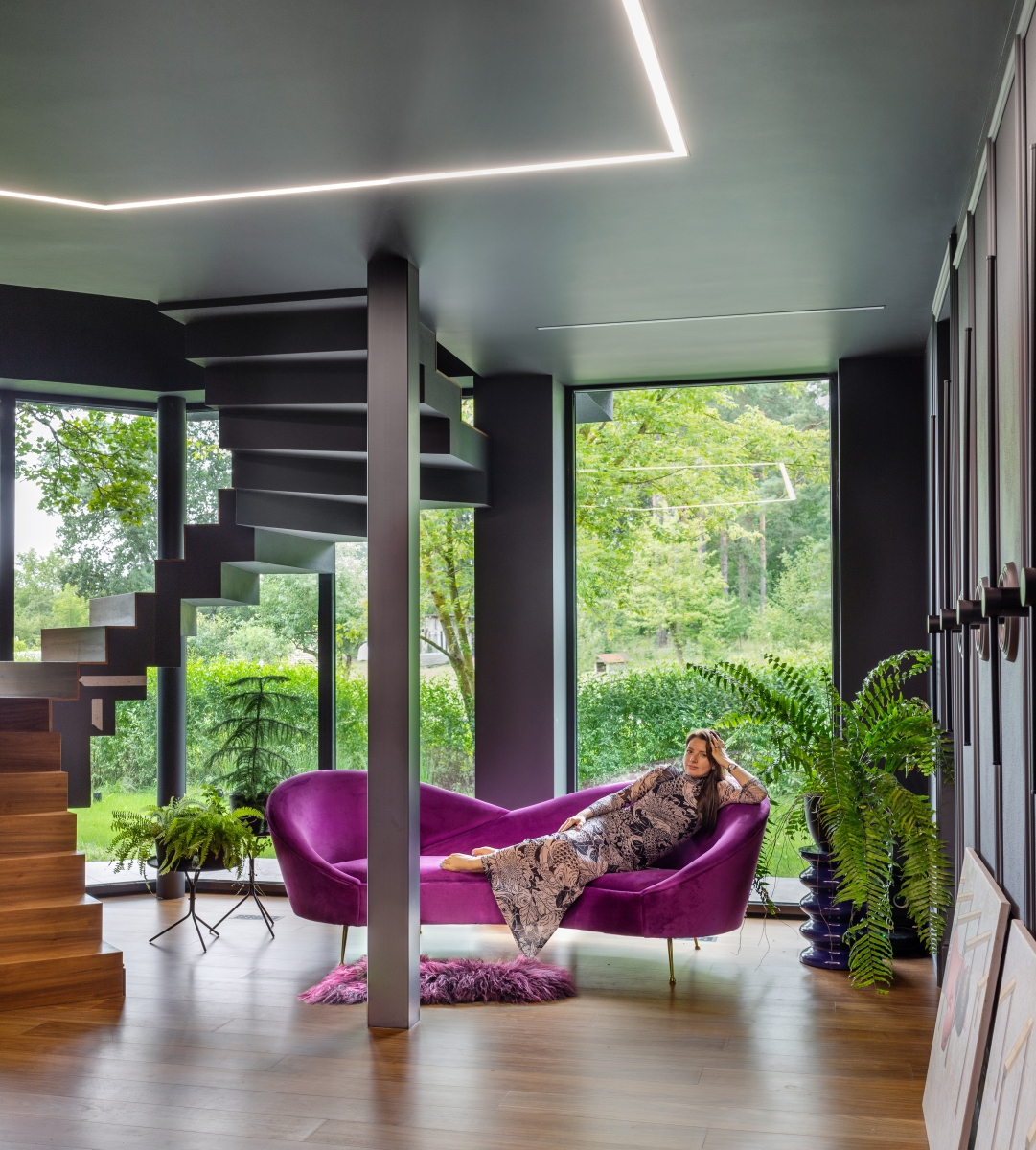 Стоит отметить, что в этом доме невероятно крутая исходная архитектура. Мы зашли туда с дизайном, и наша задача была — наполнить пространство, подчеркнуть необычную геометрию, сохранить целостность, не разбивая его на отдельные объёмы.