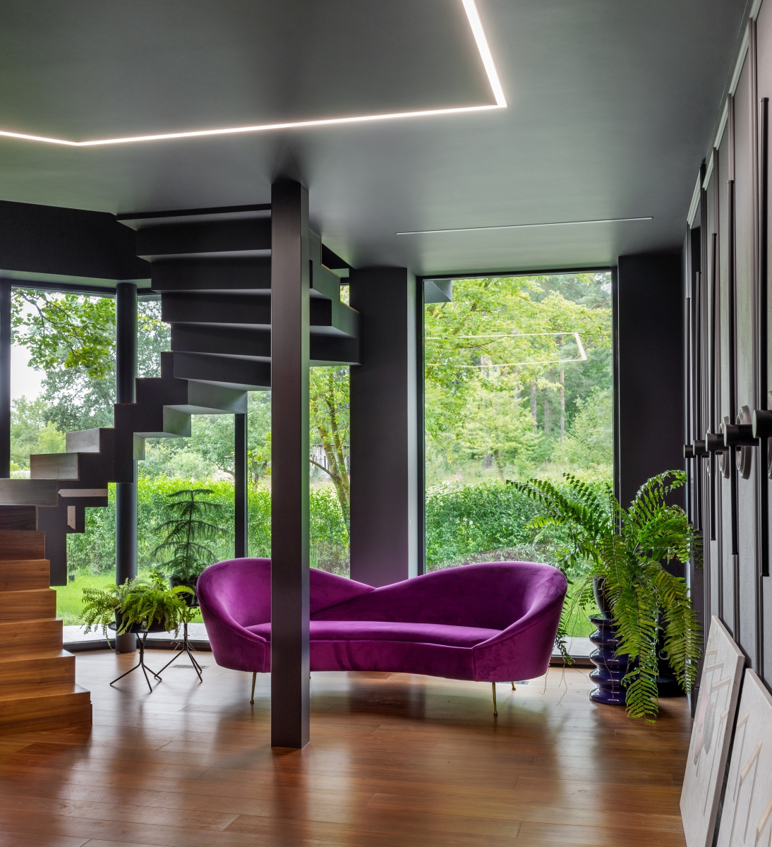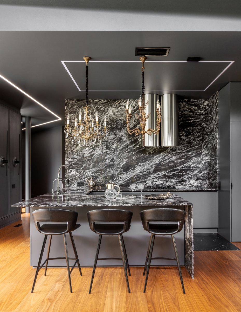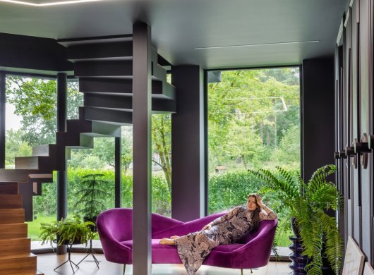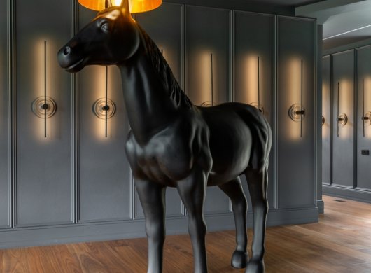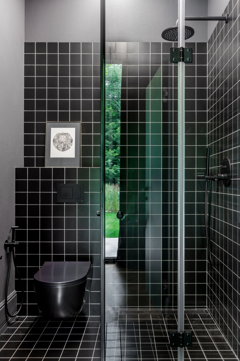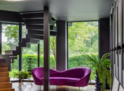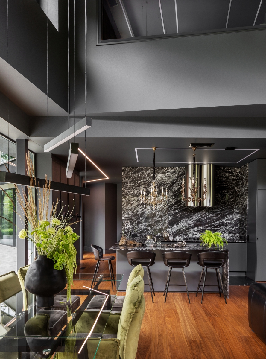 Так здесь появился полный моноколор. Все стены и потолки дома выкрашены в один цвет — тёмный, почти чёрный, серый. И яркое, максимально необычное наполнение пространства, полностью отражающее заказчиков: смелых, дерзких, с тонким вкусом.