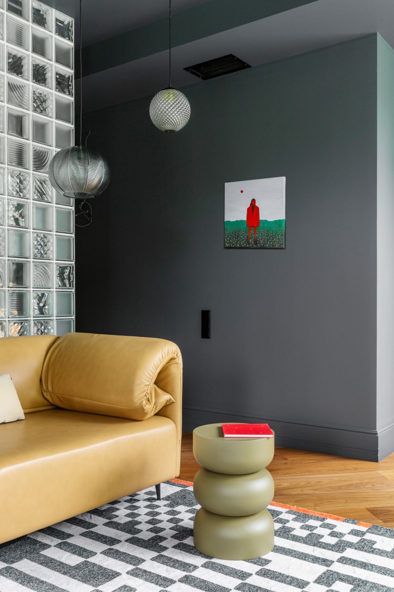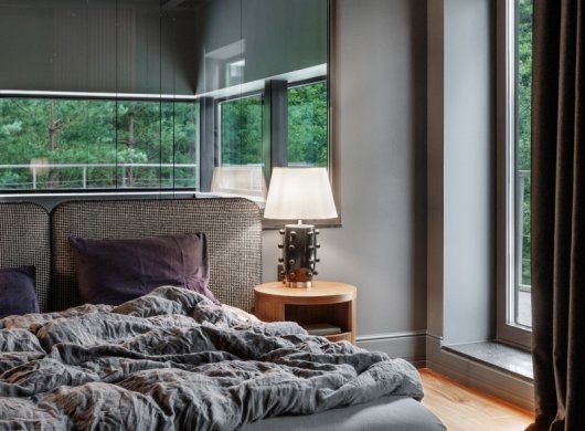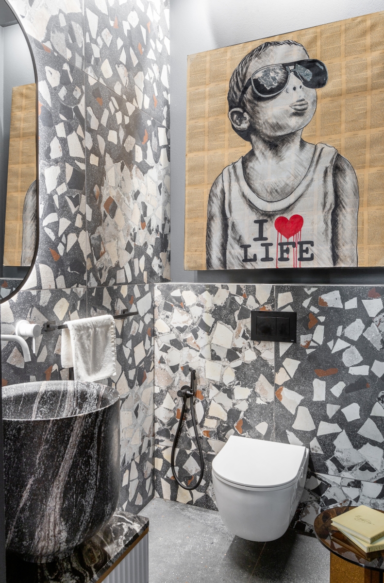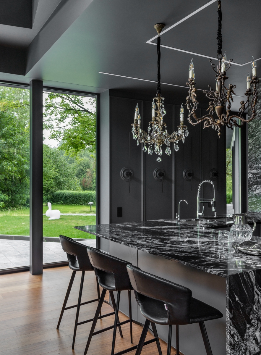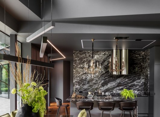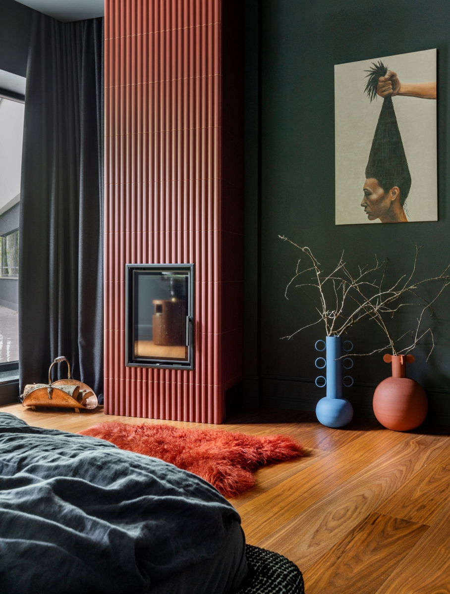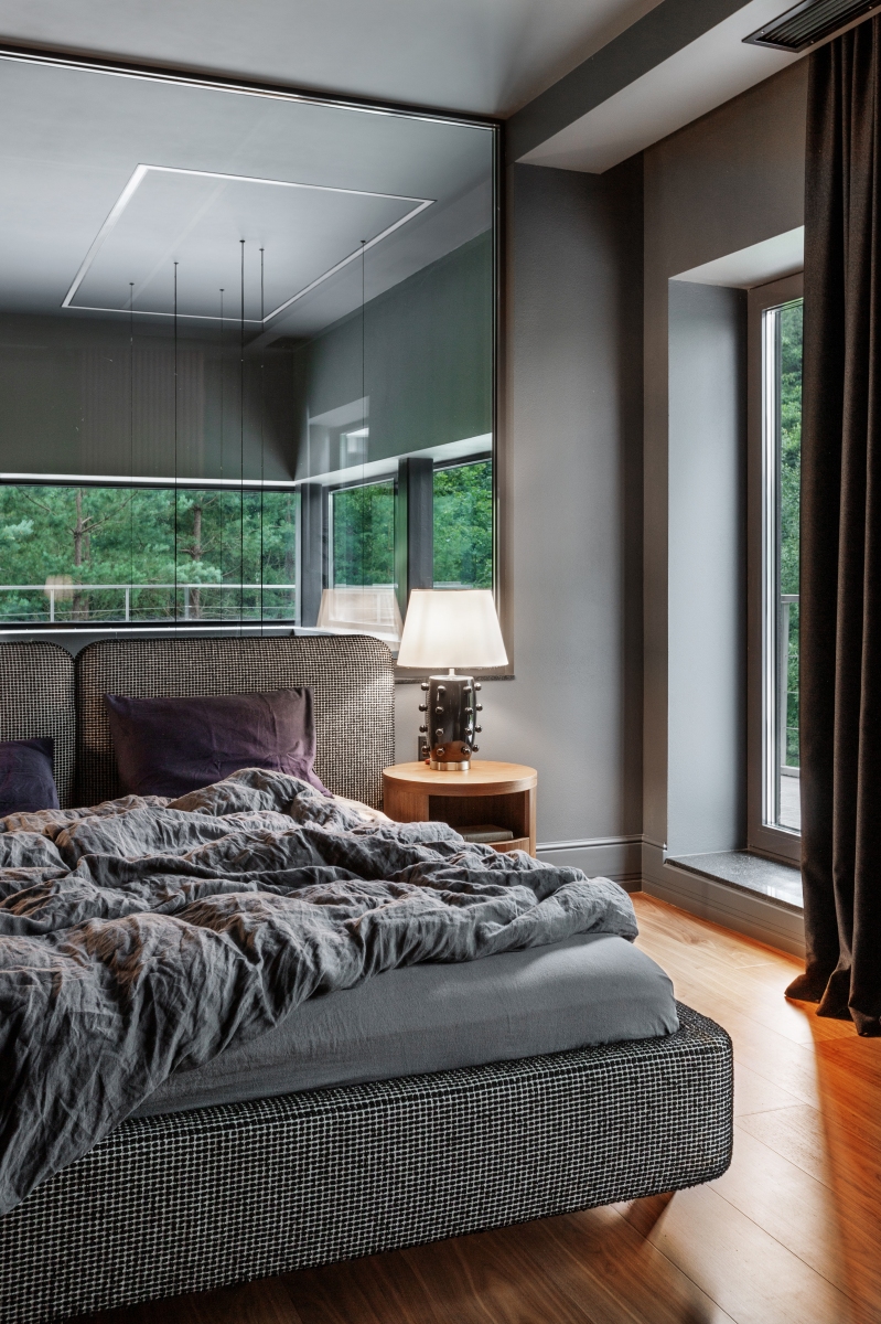 Так здесь появился полный моноколор. Все стены и потолки дома выкрашены в один цвет — тёмный, почти чёрный, серый. И яркое, максимально необычное наполнение пространства, полностью отражающее заказчиков: смелых, дерзких, с тонким вкусом.