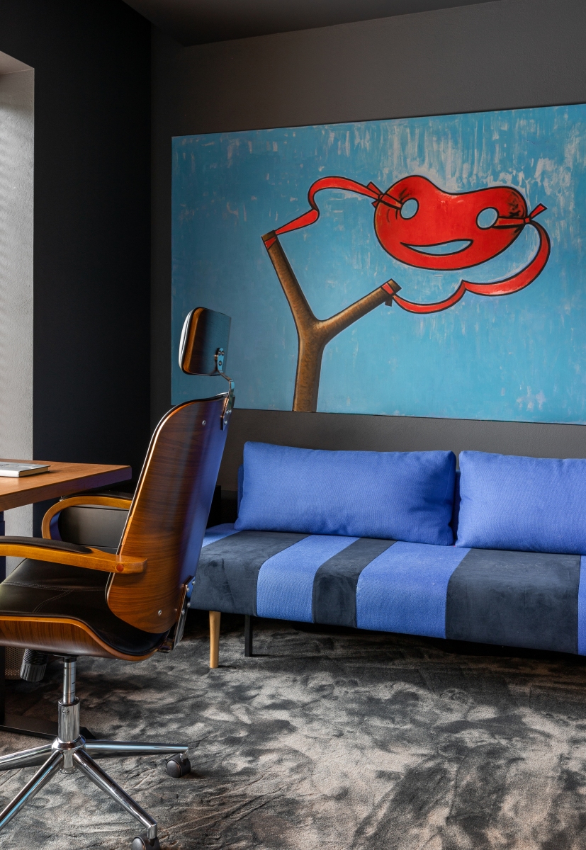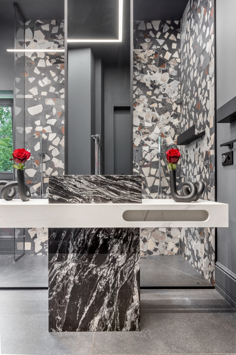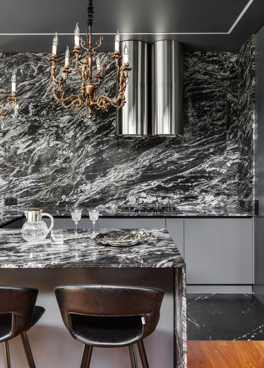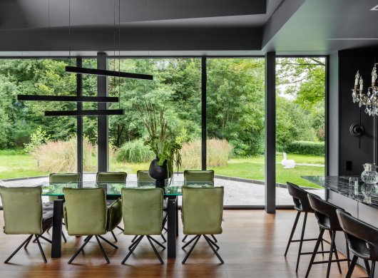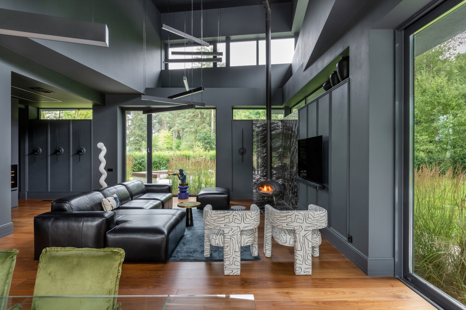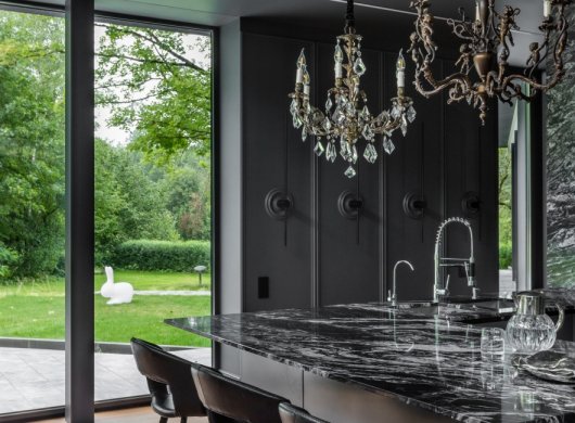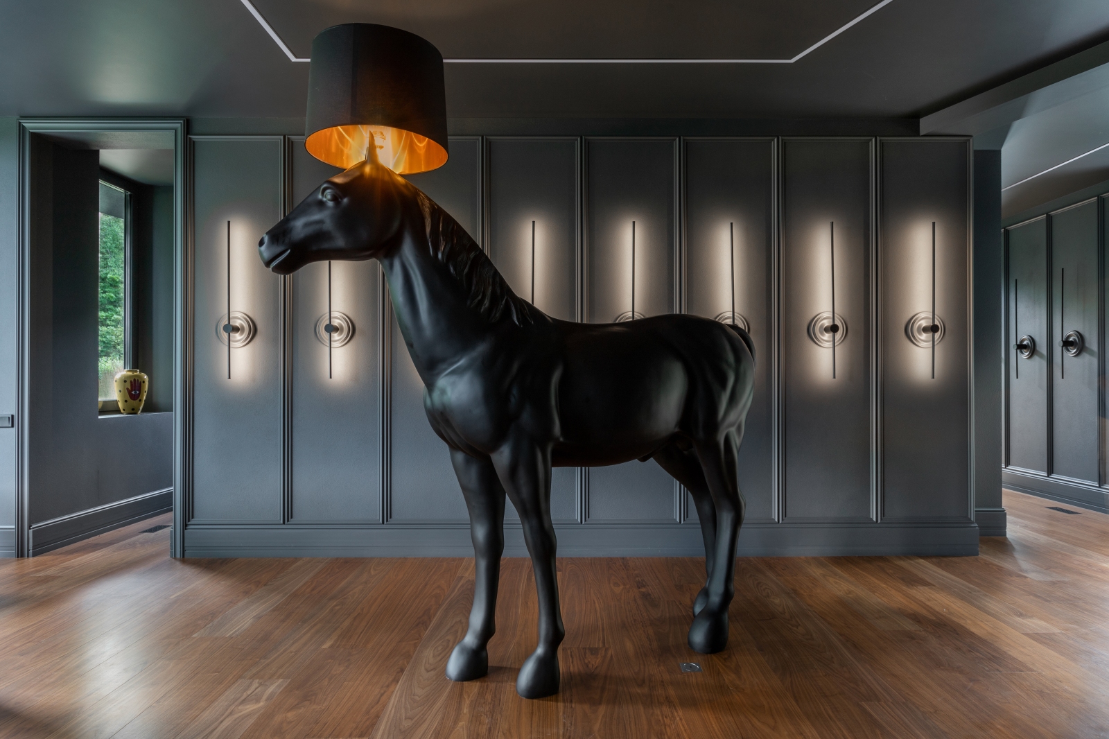 Так здесь появился полный моноколор. Все стены и потолки дома выкрашены в один цвет — тёмный, почти чёрный, серый. И яркое, максимально необычное наполнение пространства, полностью отражающее заказчиков: смелых, дерзких, с тонким вкусом.