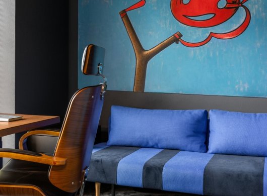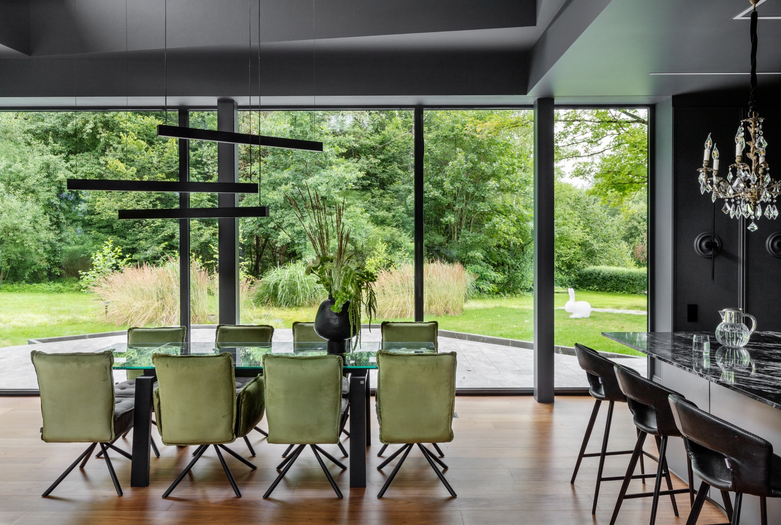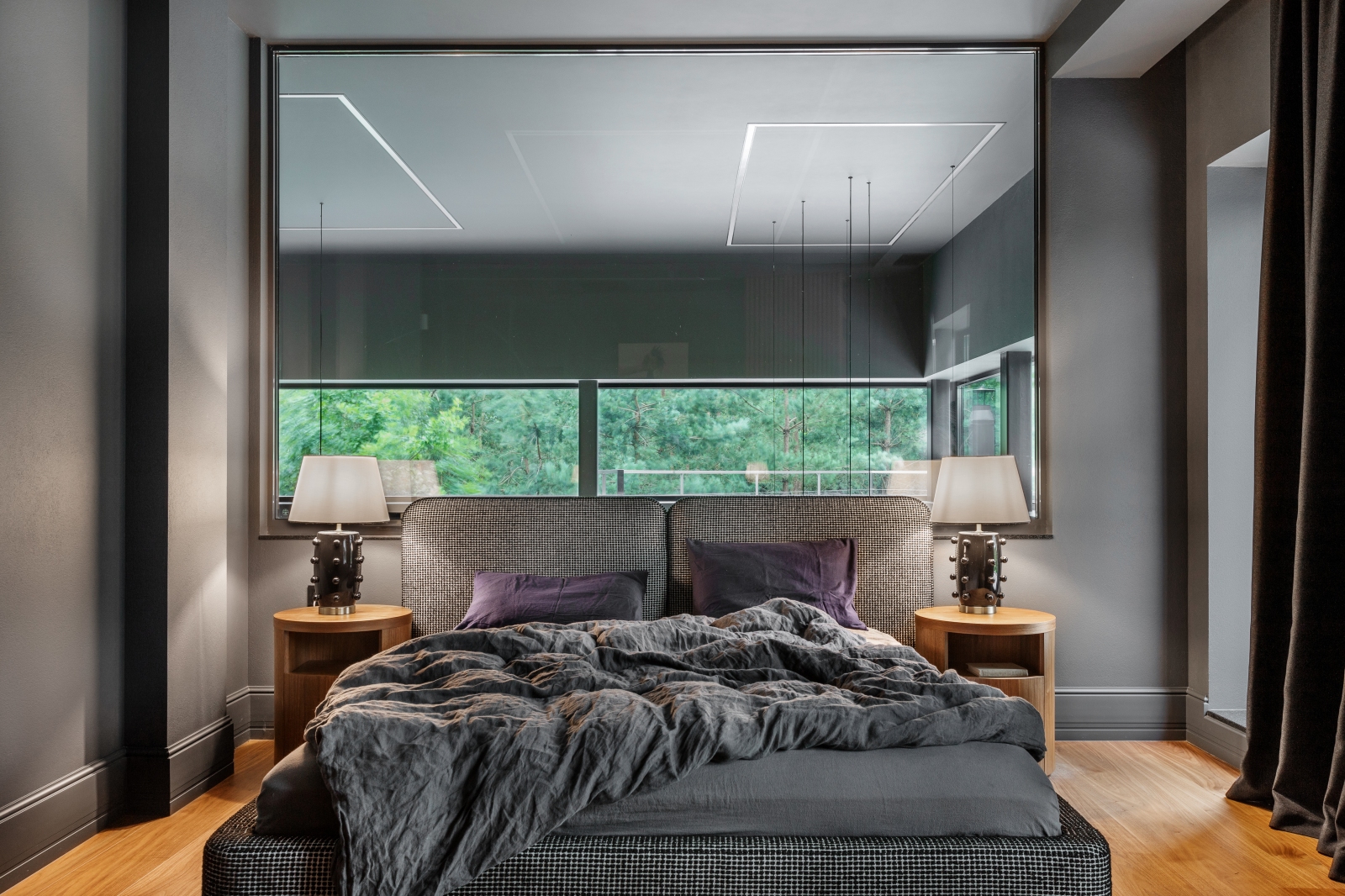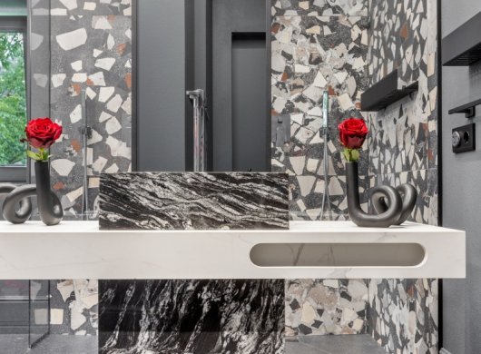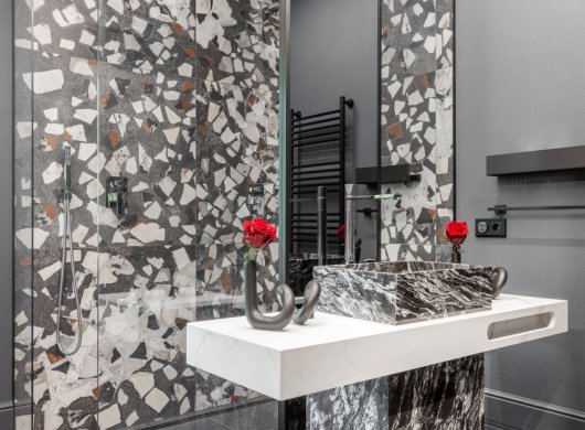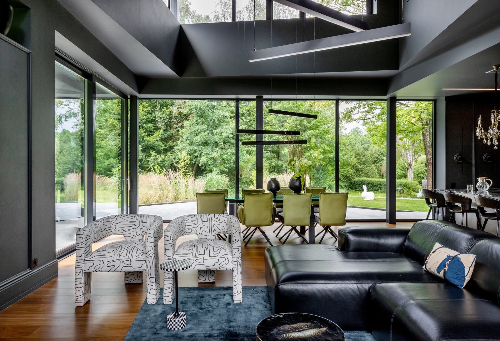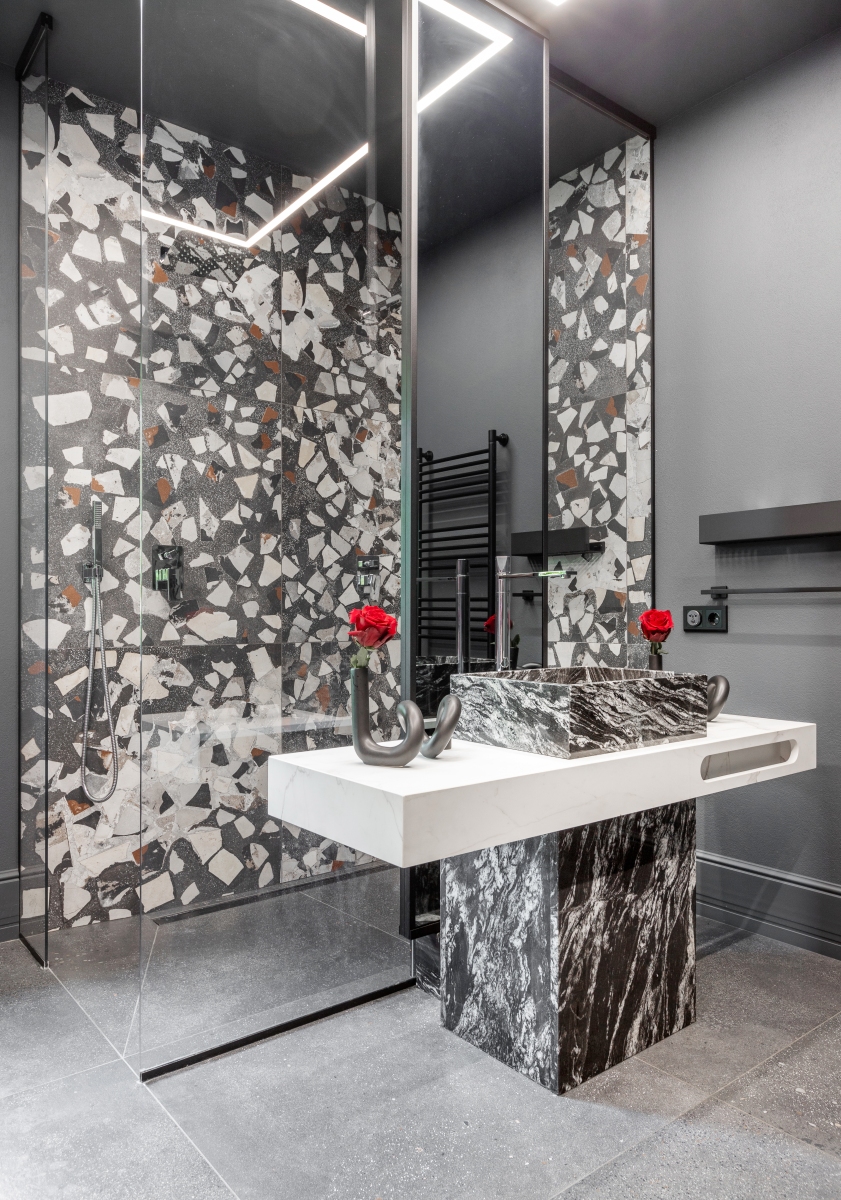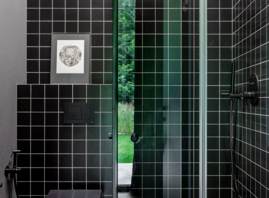 Так здесь появился полный моноколор. Все стены и потолки дома выкрашены в один цвет — тёмный, почти чёрный, серый. И яркое, максимально необычное наполнение пространства, полностью отражающее заказчиков: смелых, дерзких, с тонким вкусом.