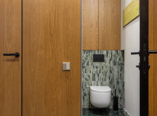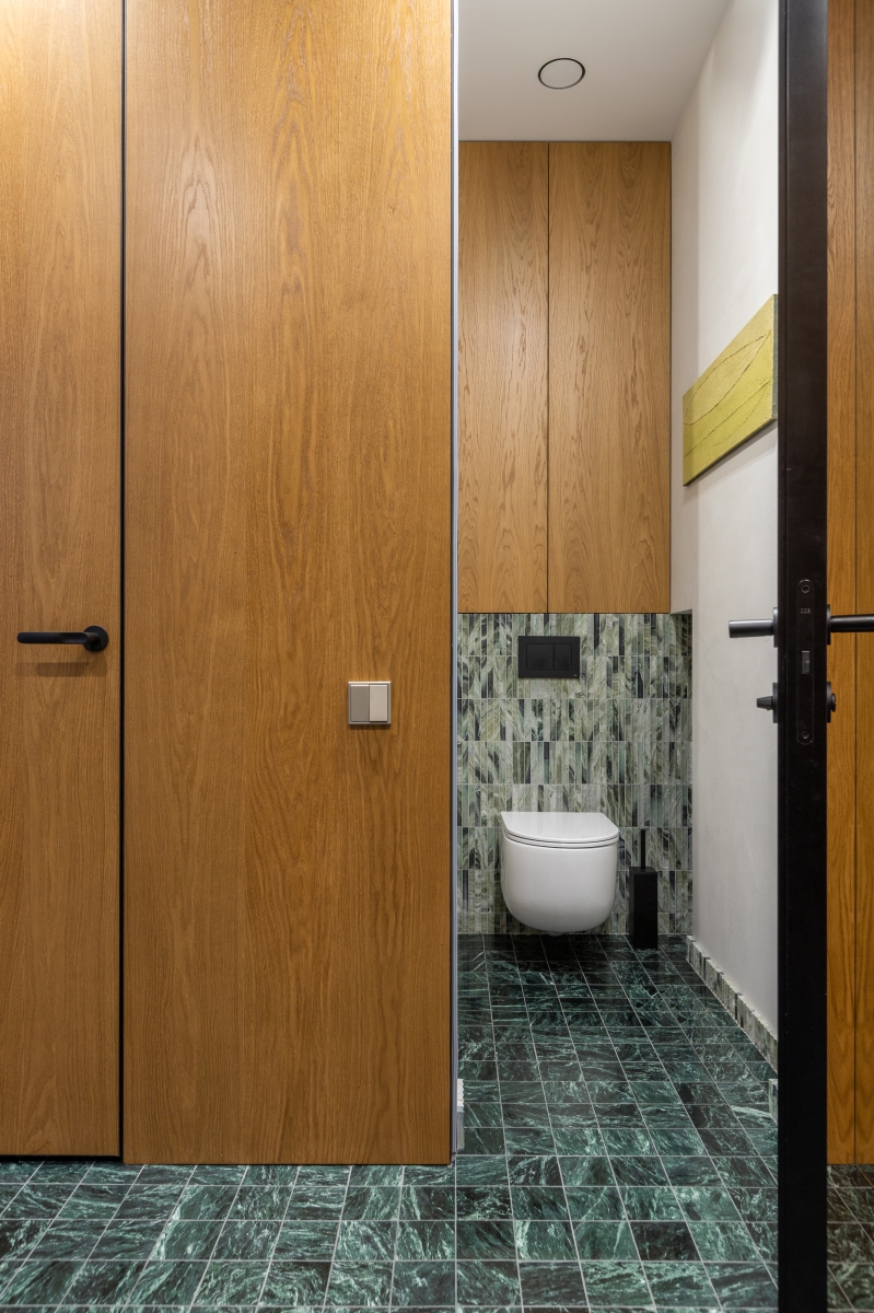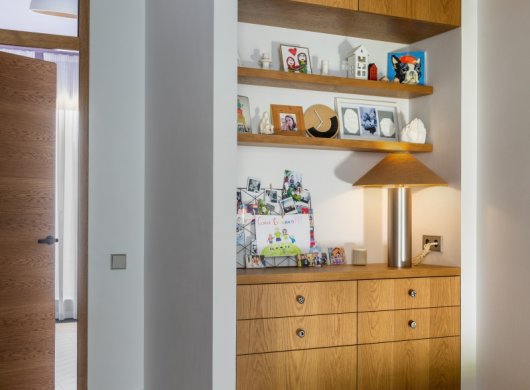 Здесь же гостевой санузел, котельная с вместительным хранением и шкафы. Одна из створок ведет в небольшой гардероб, организованный под лестницей. Там я храню сезонную одежду и обувь.