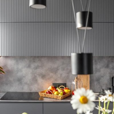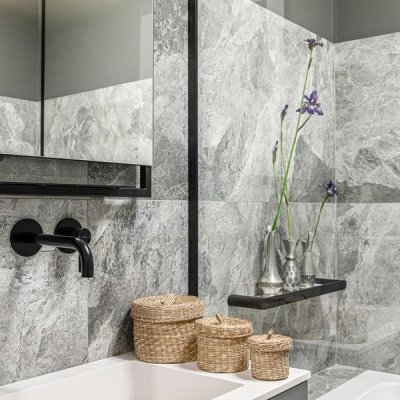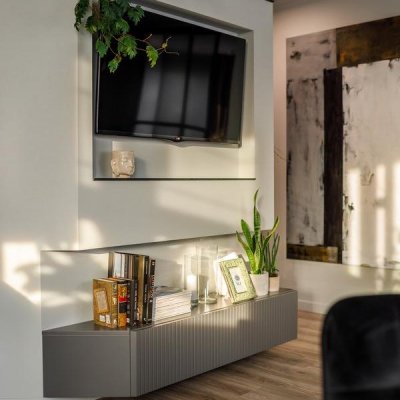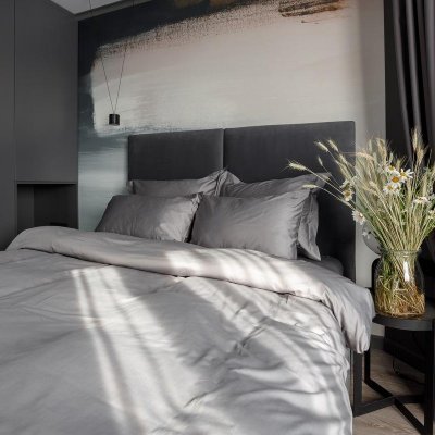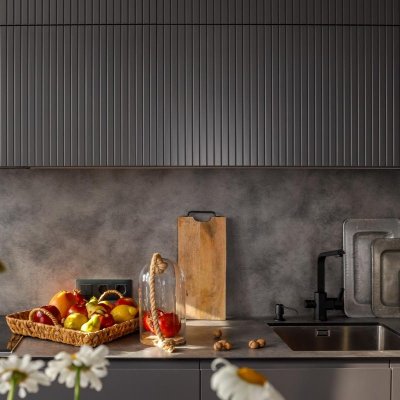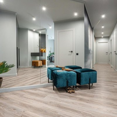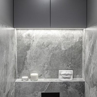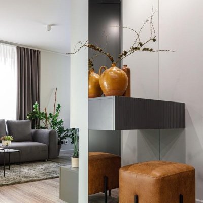 Общая цветовая схема интерьера строилась на нейтральном фоновом сером цвете, он был использован локально, включая потолки, плинтусы, карнизы, межкомнатные и входные двери.