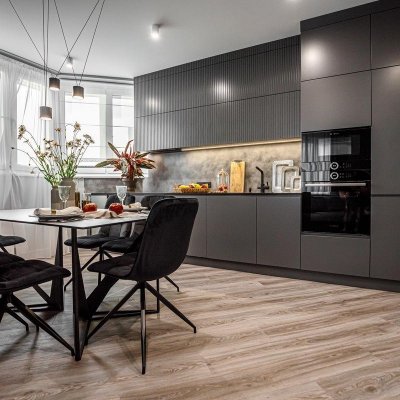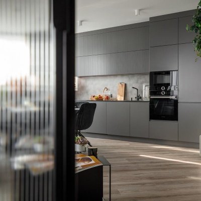 Перед нами стояла задача перепланировать пространство так, чтобы в просторной трехкомнатной квартире нашлось место для четвертой комнаты. Две детские комнаты дизайн не затрагивал, а все остальное пространство было организовано так, что нашлось место и для полноценной спальни, 14 квадратных метров, с вместительным шкафом, и для гостиной, объединенной с кухней, и для прихожей и даже небольшой прачечной.