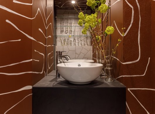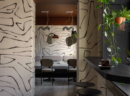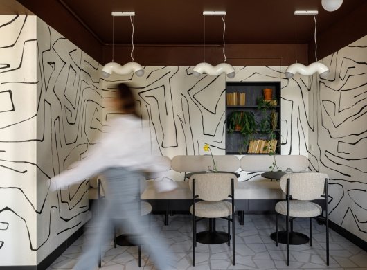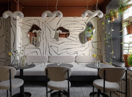 При разработке концепции отталкивались от того, что заведение имеет узкую ориентацию – кофейня. Поэтому решено было работать в двух цветах – шоколадном и светло-бежевом. Основным цепляющим приемом стала суперграфика. Стены в помещении окрасили в бежевый, их вручную расписал художник по заранее подготовленному дизайнером эскизу. В туалете использован такой же прием, только с инверсией цветов – на темно-коричневом фоне нарисован паттерн светлой краской.
