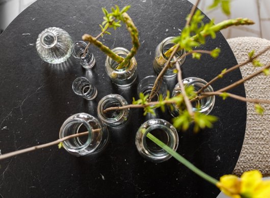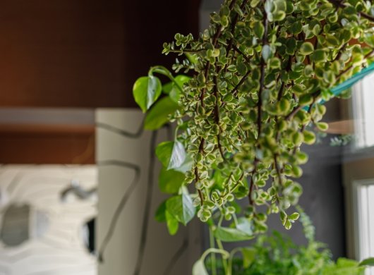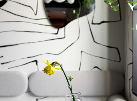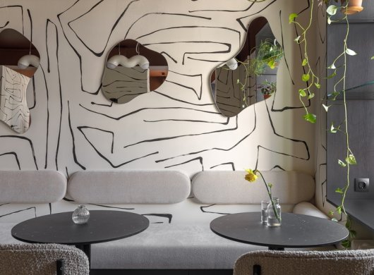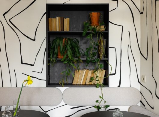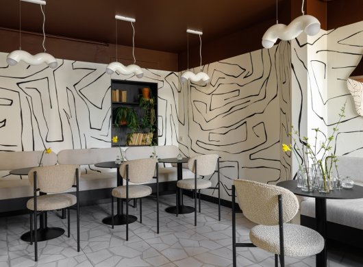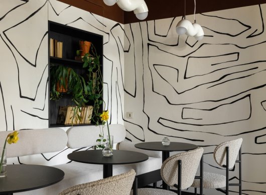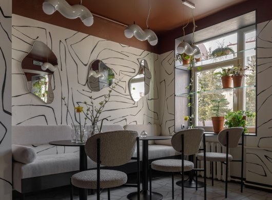 Свою лепту вносят светильники Westwing Collection. Интересная извилистая форма подчеркивает суперграфику на стенах и отлично вписывается в общую концепцию всего помещения. Также важной задачей было сделать пространство «зеленым». Поэтому на окнах размещены прозрачные полки с комнатными растениями. На столах всегда стоят вазы с сезонными цветами.