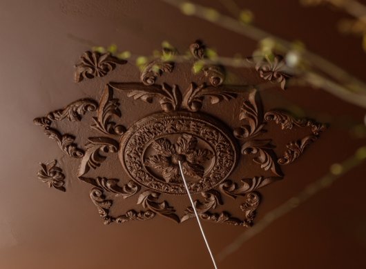 Когда начали делать демонтаж потолка Армстронг, под ним обнаружилась красивая аутентичная лепнина, которая была несколько испорчена. Нами она была частично отреставрирована и окрашена в общий цвет потолка – шоколадный.
