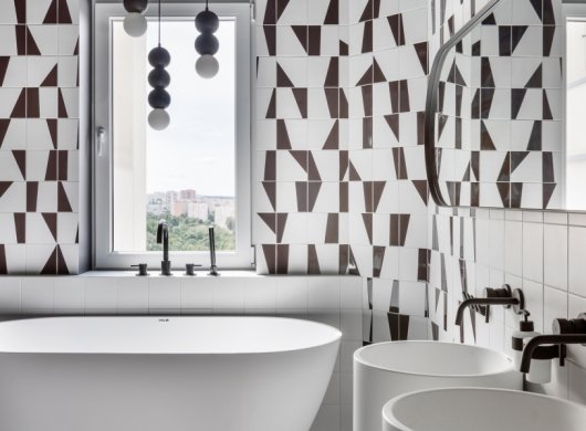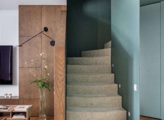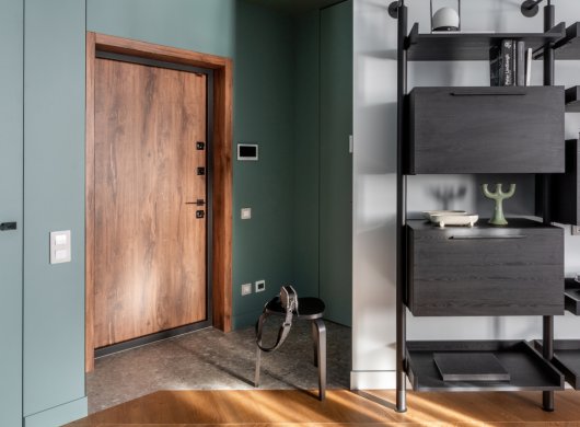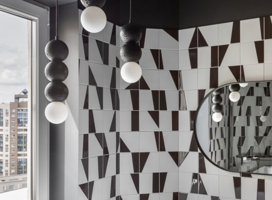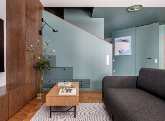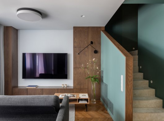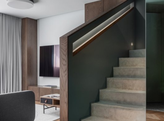 Это двухуровневая квартира общей площадью 130 кв.м со сложной исходной архитектурой. В ней очень много углов, зачастую не прямых, в некоторых комнатах нет параллельных друг другу стен. К тому же, заказчики хотели определенный набор помещений, которые нашей студии удалось разместить в достаточно ограниченных квадратных метрах.