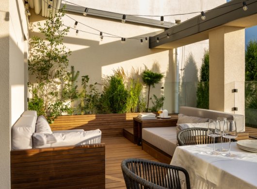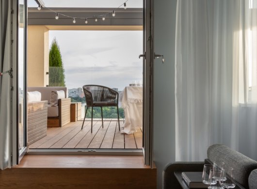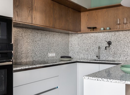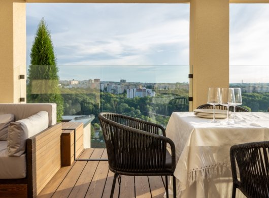 Квартира расположена в живописном районе Гродно. Отсюда открывается невероятно красивый вид на реку, зеленый массив и старые дома в исторической части города. Невероятными видами и красивыми закатами можно любоваться с террасы, примыкающей к гостиной, с высоты 15 этажа.